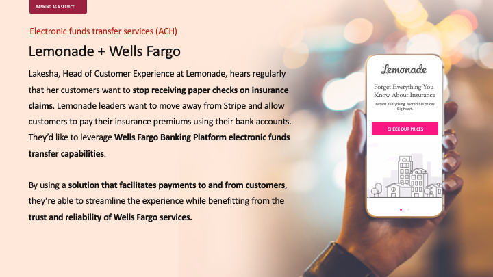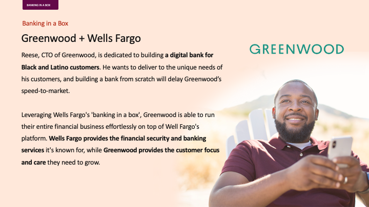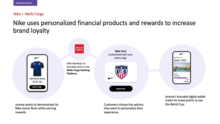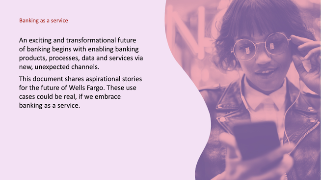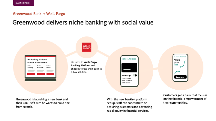 Illustrate, in words and imagery, an aspirational vision where Wells Fargo grows into banking-as-a-platform service over time, from basic embedded finance to offering banking-in-a-box services.