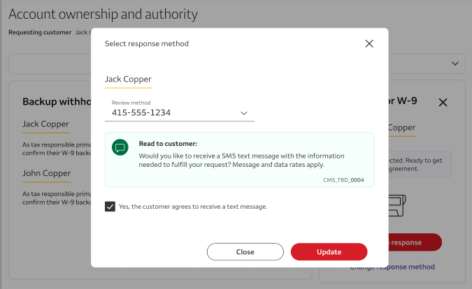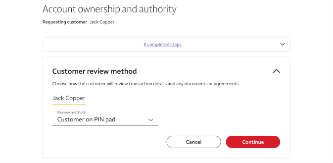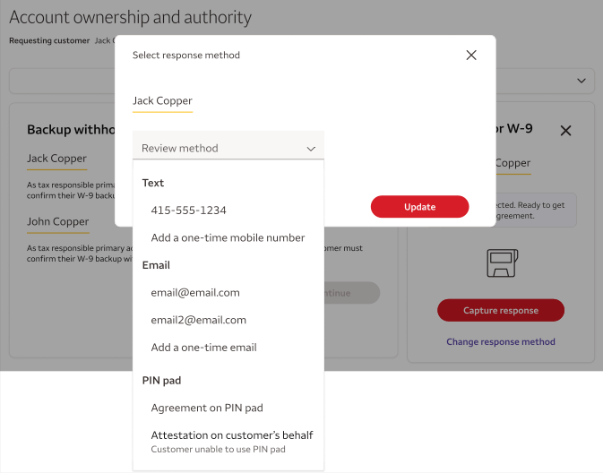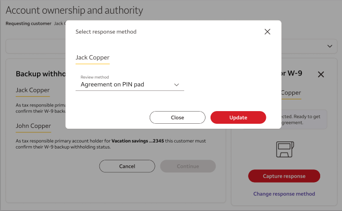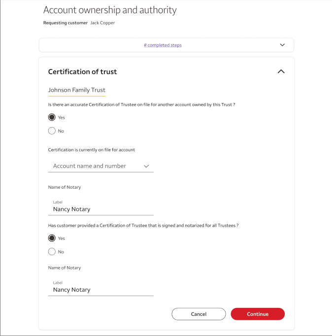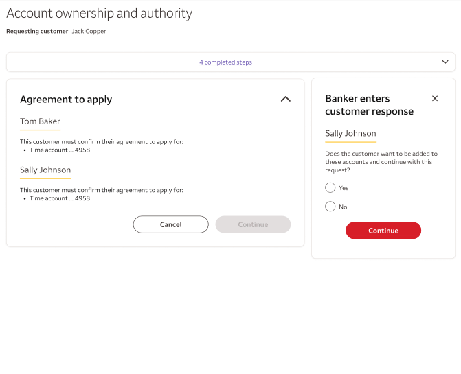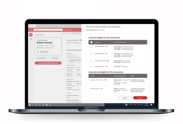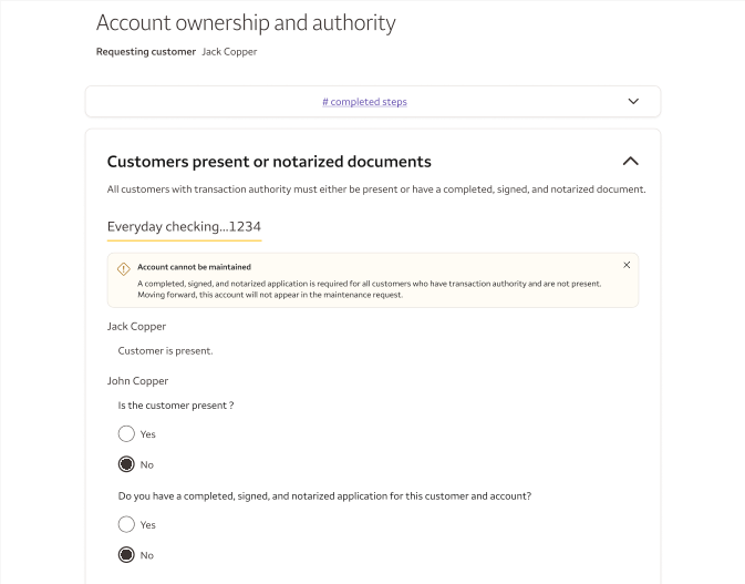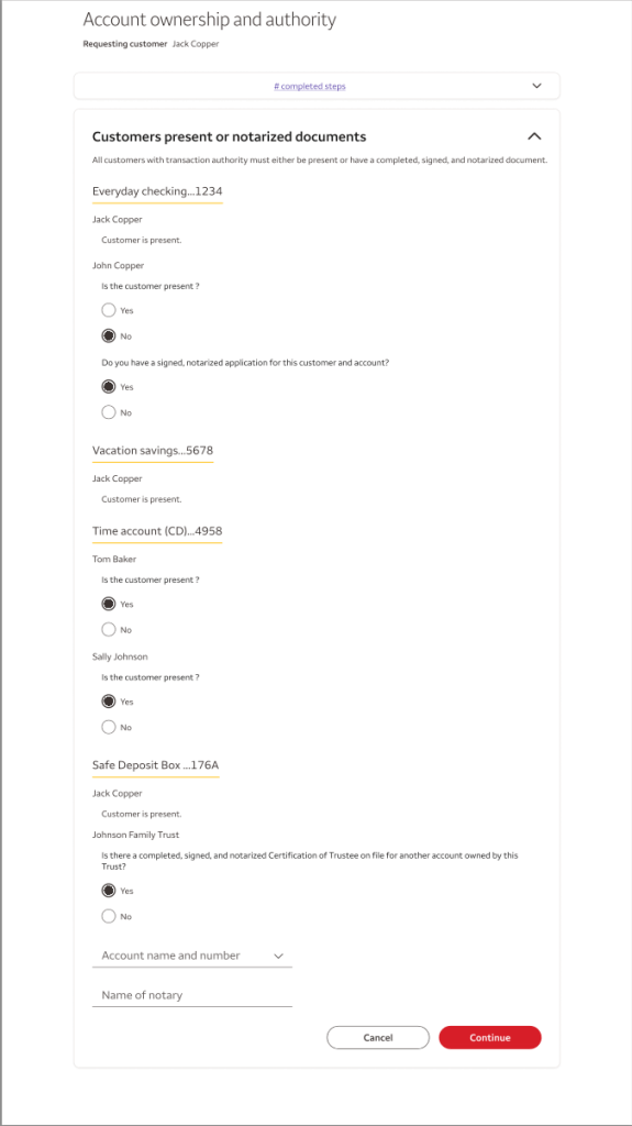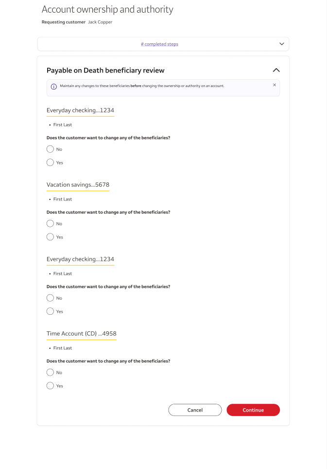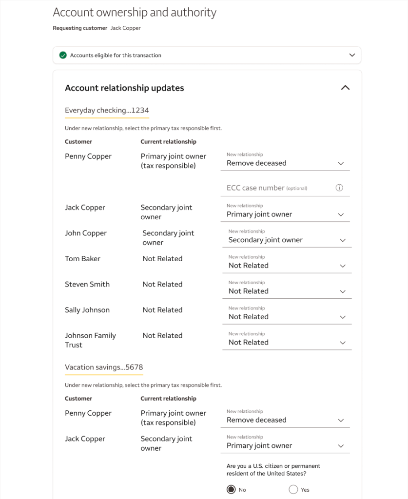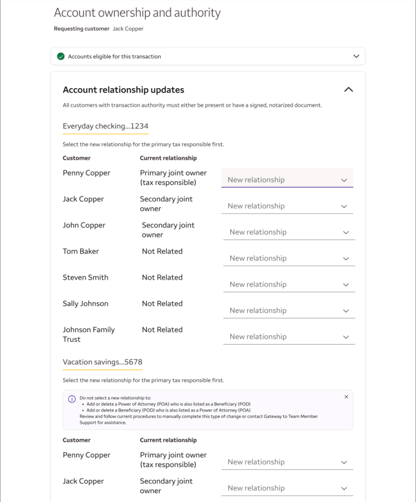 This banker task updates the customers’ relationship to their bank accounts. It’s a complex. Being the primary, tax-responsible account holder is different than being a beneficiary. Changing the interaction requires specific steps and consent. The new design makes it easier for bank employees to make relationship updates and follow required procedures.